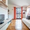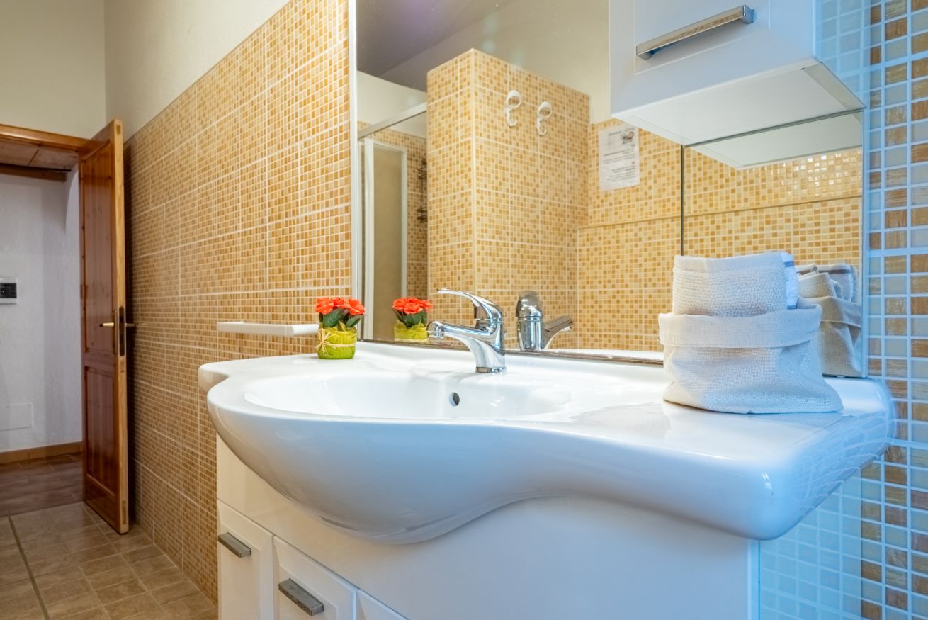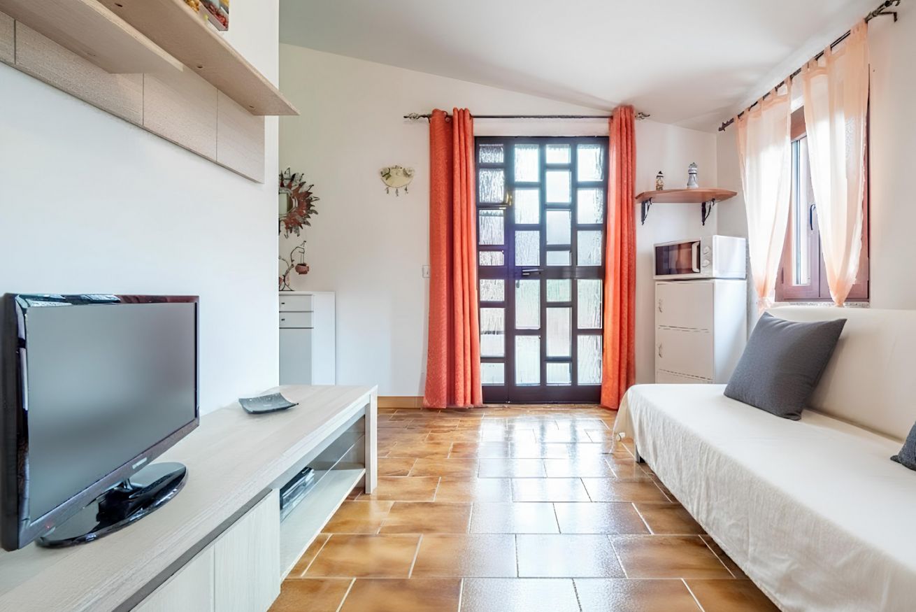 The apartment on the first and last floor consists of: • air-conditioned living room with a sofa and TV, a table with 4 seats, and a kitchenette • a bedroom with a double bed and direct access to the terrace • complete bathroom with a washing machine. A foldable cot allows accommodation for a third guest. Outside, the spacious terrace has an outdoor table. In addition to the courtyard complete with an outdoor shower and barbecue, always within the property, a large lawn is available for walking and letting your children play. All rooms have windows facing the courtyard. Free Wi-Fi and parking. The most beautiful beaches of Chia and all essential services are just a short distance away.