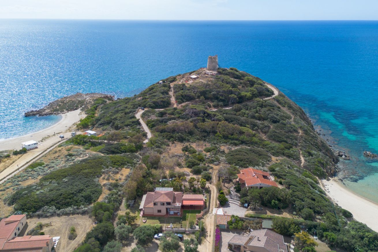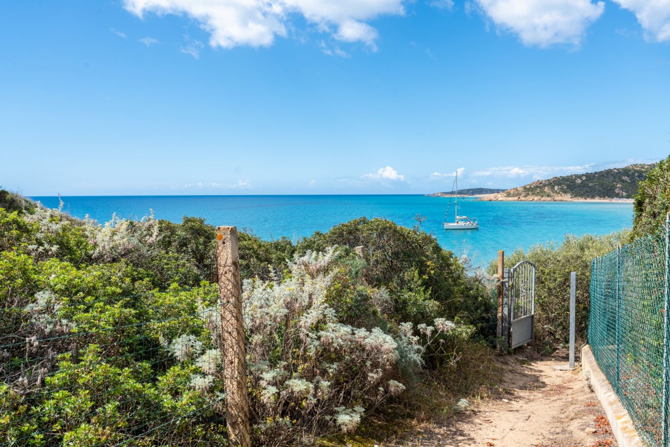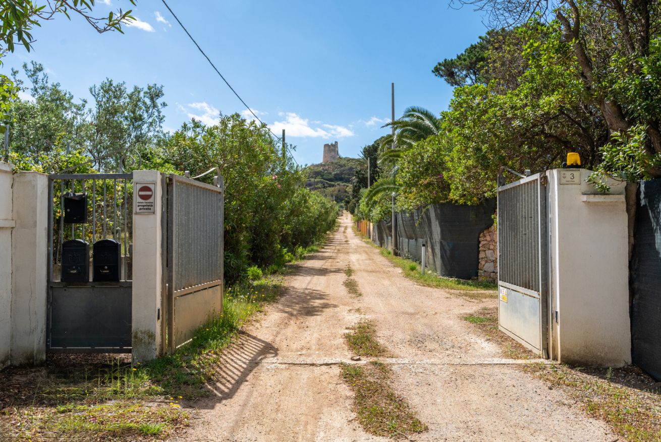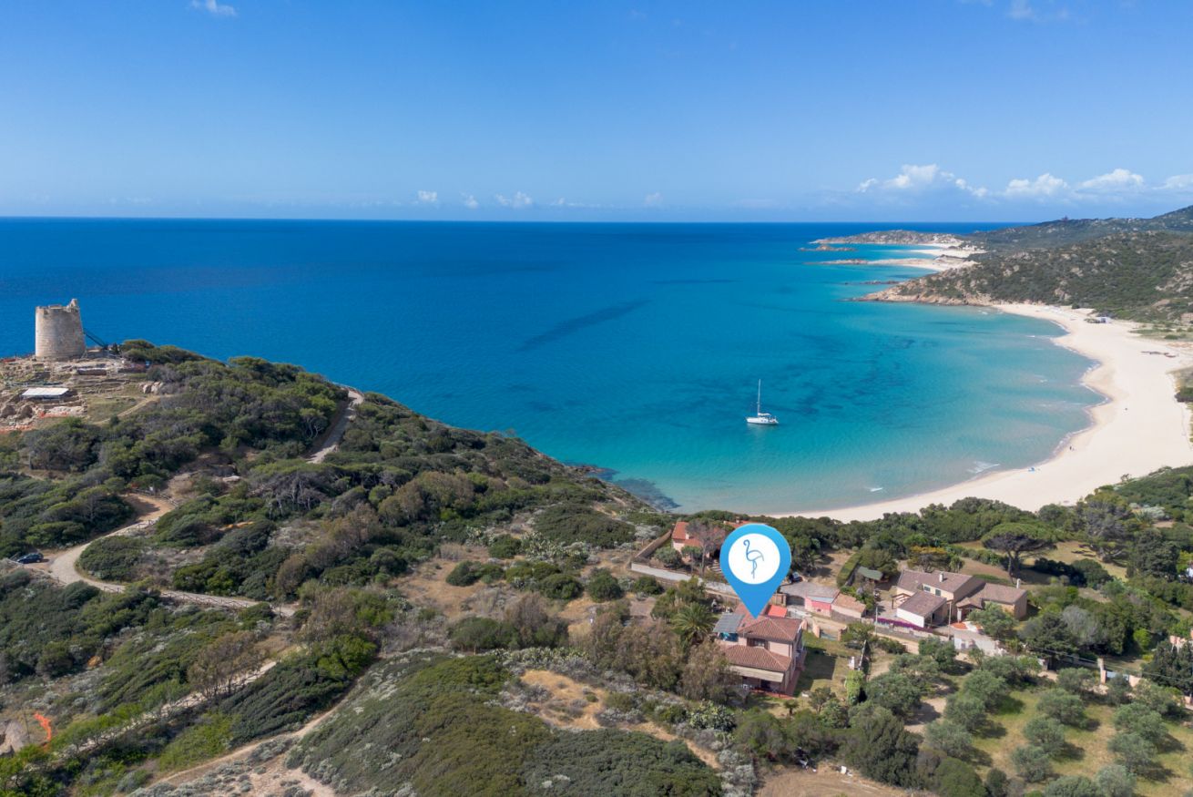 La casa si trova a Chia, a pochi passi dalle spiagge di Sa Colonia e Su Portu. Via Giovanni Pascoli, è in terra battuta non asfaltata ma facilmente percorribile con qualsiasi vettura. Dalla casa si possono raggiungere in un minuto a piedi sia la spiaggia di Sa Colonia, che quella di Su Portu. Altre spiagge consigliate sono la “Su Giudeu”, “Cala Cipolla”, “Tuerredda”. Il villaggio di Pula attrae molti visitatori grazie ai numerosi negozi e locali aperti la notte. Il villaggio più vicino è Domus De Maria, dove sono presenti farmacia, banca, e altri servizi. Il complesso archeologico di Nora e le sue mitiche rovine, le grotte di Is Zuddas a Santadi, il parco boschivo di Is Cannoneris rendono questo un luogo perfetto per l’esplorazione. Gli appassionati di hiking potranno avventurarsi nell’antica strada romana del IV sec d.C, un percorso che collegava Nora e Bithia, e dal quale è possibile ammirare le calette di questo bellissimo tratto costiero. I servizi di Chia come il bar Mongittu, il ristorante pizzeria Mirage, le rivendite di frutta locale, e il mini market Sirio sono tutti raggiungibili con un minuto di auto.