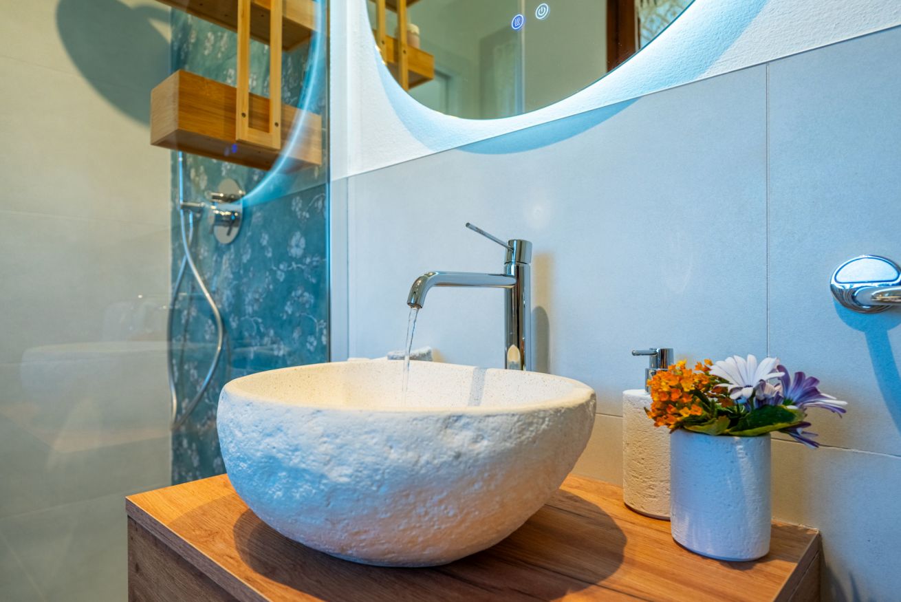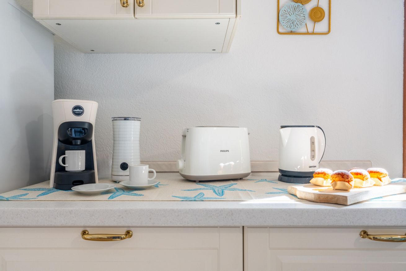 The apartment on the first and last floor consists of: • living room complete with a table with 4 seats • equipped kitchenette with dishwasher • one bedroom with a double bed and access to a terrace overlooking the sea • one bedroom with two single beds • bathroom with shower and washing machine • large terrace with an outdoor table with 6 seats. Two split units for air conditioning/heating are available in the living room and in the bedroom with the double bed. Unlimited free Wi-Fi and parking space. The house is part of a family villa, where there are a total of 4 apartments. You can park your vehicle for free in the driveway and use the portion of the courtyard in front of the house where outdoor shower and barbecue are available.